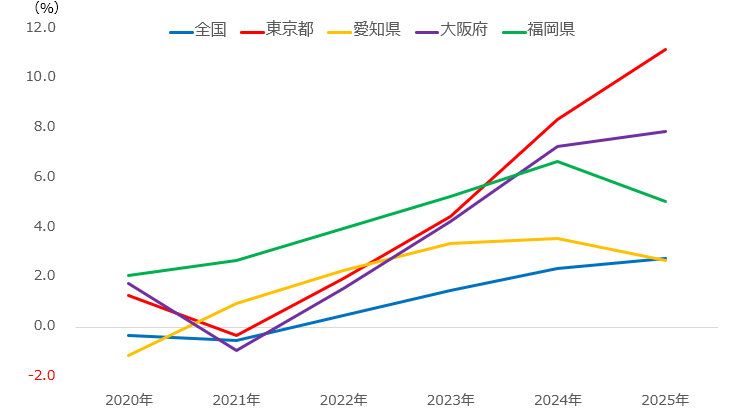 2位は大阪府で+7.9%(昨年は7.3%)。萬博開催などを契機にインバウンド観光客と國內観光客が大幅に増加、またJR大阪駅北側の「グラングリーン大阪」がオープンと、梅田エリアの再開発が進んでいます。3位は沖縄県で+7.1%(昨年は+6.1%)、4位は神奈川県でプラス7.0%(昨年は+6.2%)、5位は京都府でプラ+ス5.7%(昨年もつ5.7%)となりました。沖縄と京都は引き続き観光需要が活況であることが大きな要因となっていると思われます。