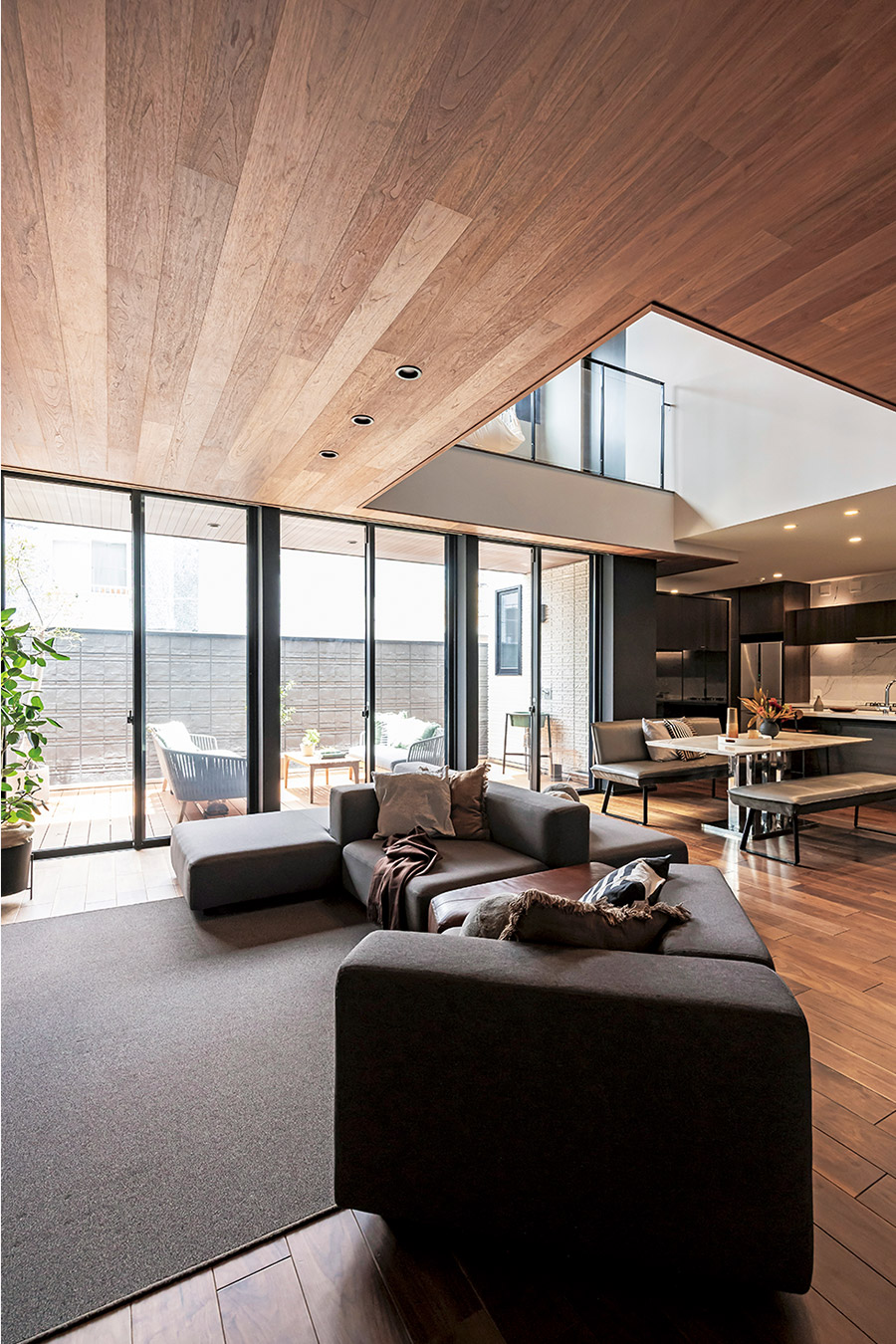 ご夫妻が目指されたのは、ホテルで過ごすような非日常感と、心から安らげる暮らしやすさの両立でした。ウォルナットの落ち著いた色味を基調(diào)に造作家具も多く取り入れ、唯一無二の空間をつくりました。