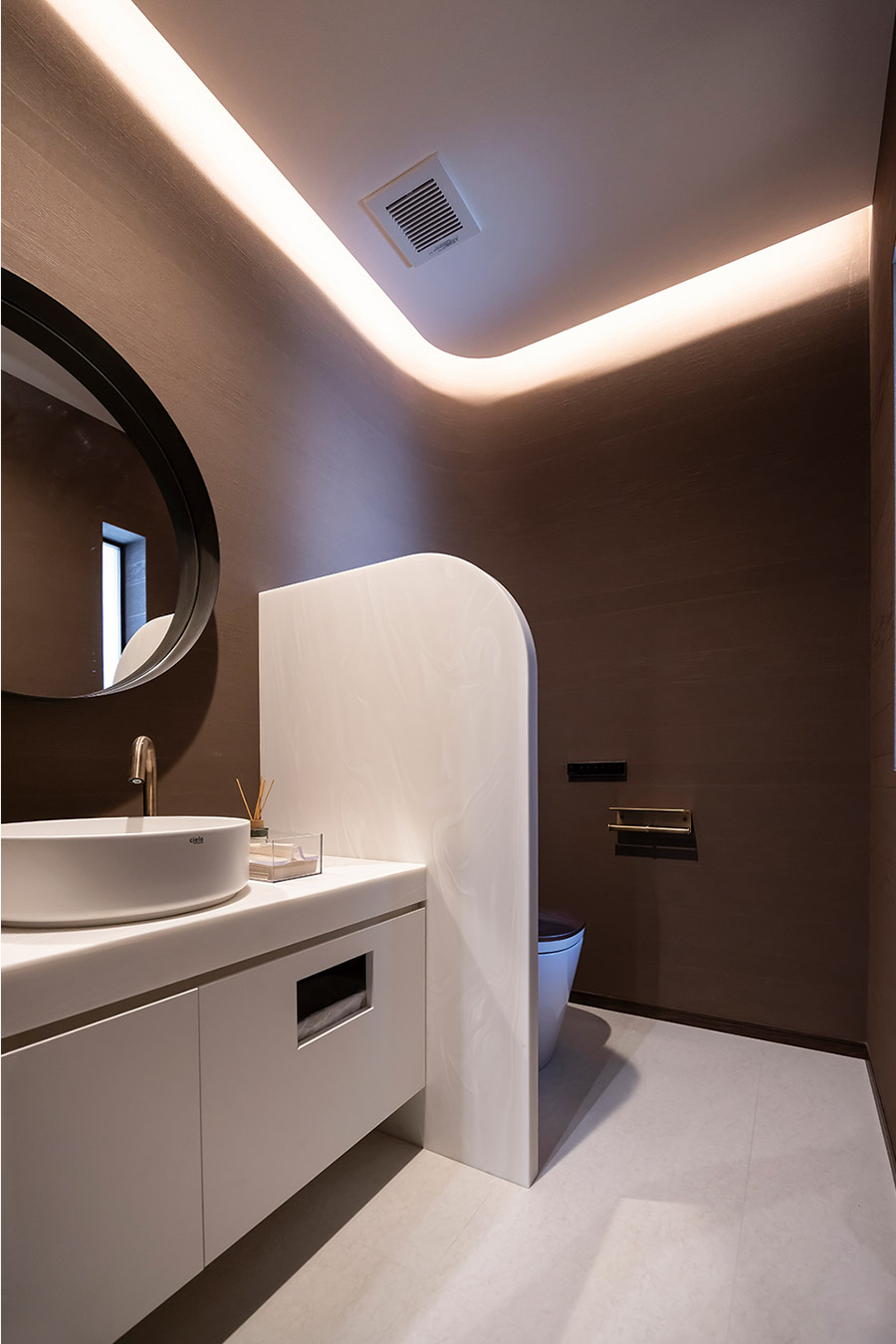 生活感を感じさせない、おしゃれな空間にしたいというご要望はトイレにも反映されています。印象的なテラコッタカラーの壁紙を背景に、Rを描く袖壁と天井がアクセントとなり、洗練された雰囲気を演出しています。