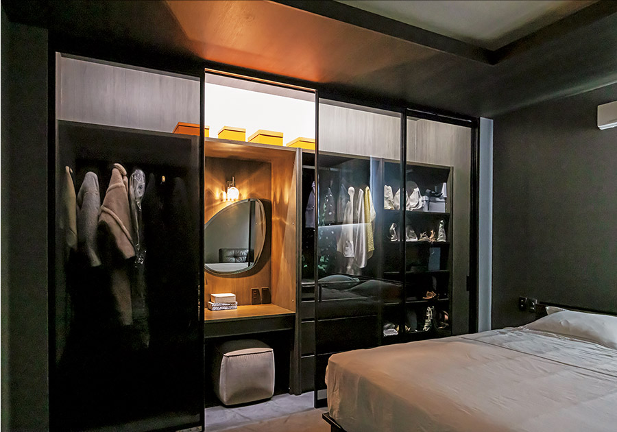 主寢室の一角に設(shè)えたのは、ガラス扉が印象的な“見せる?yún)Ъ{”。お?dú)荬巳毪辘窝蠓湫∥镱悿騾Г幛搿⒚坤筏ぅ伐绌`ケースです。「眺めるだけで気分が高まります」とCさん。
