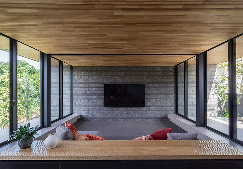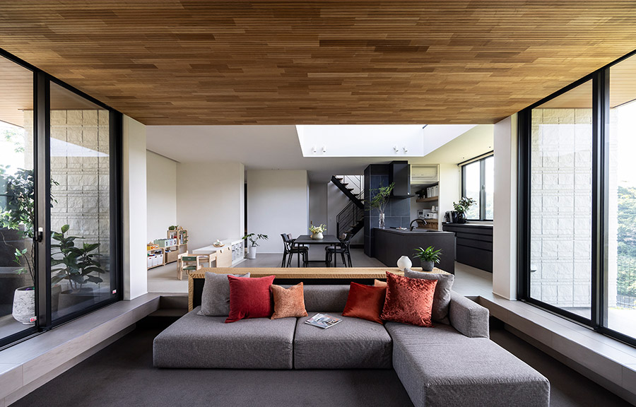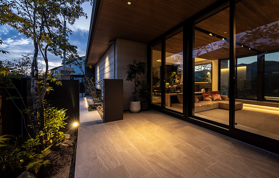 ロースタイルリビングには開口部をシンメトリーに配しました。室內から屋外の袖壁まで連続させたアクセントタイルや、天井面と軒天の意匠をつなげた設計によって、內と外をシームレスに一體化。実際の面積以上の広がりを感じる空間が生まれています。