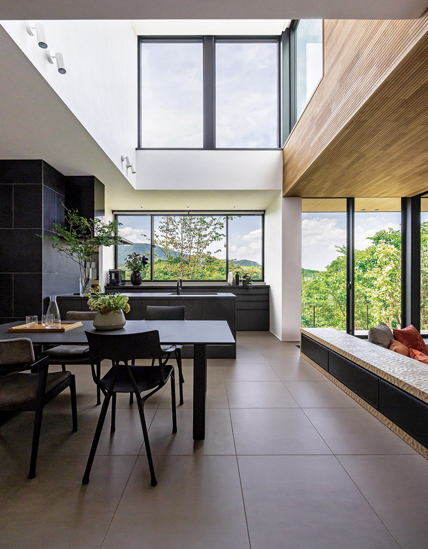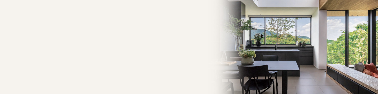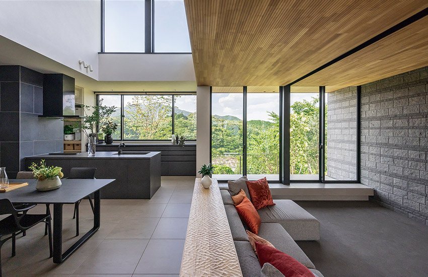 窓の向こうに見える山並みや木立、ぽっかりと切り取られた空。LDKに一歩足を踏み入れると、住宅街にいることを忘れてしまうほどの眺望が目に飛び込んできます。「窓をたくさん設けて、風が通り抜ける家にしたい」というSさまの願いをかなえた、自然と隣り合わせの住まいです。