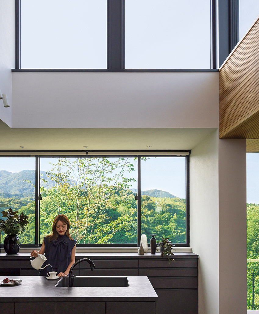 窓の向こうに一面の緑が広がるキッチン。腰高収納の上には景色を遮る家電や小物は極力置かず、視界の抜けを大切にしているそう