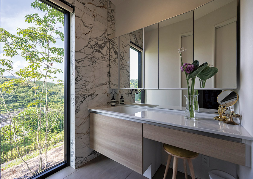 洗面室は大理石調タイルに縁取りされたFIX窓から光が差し込み、やわらかい明るさの中で身支度ができます