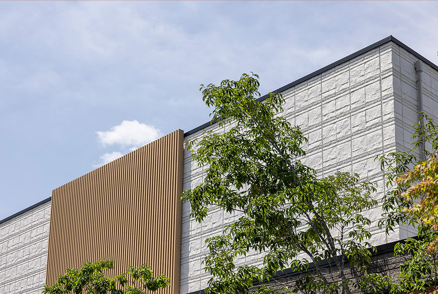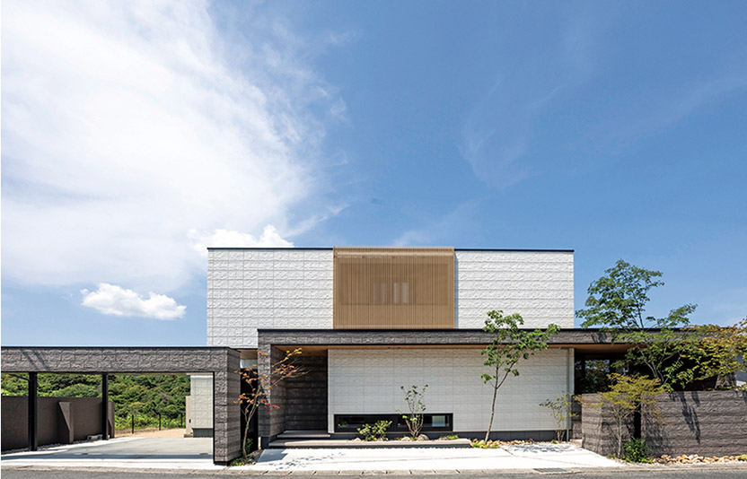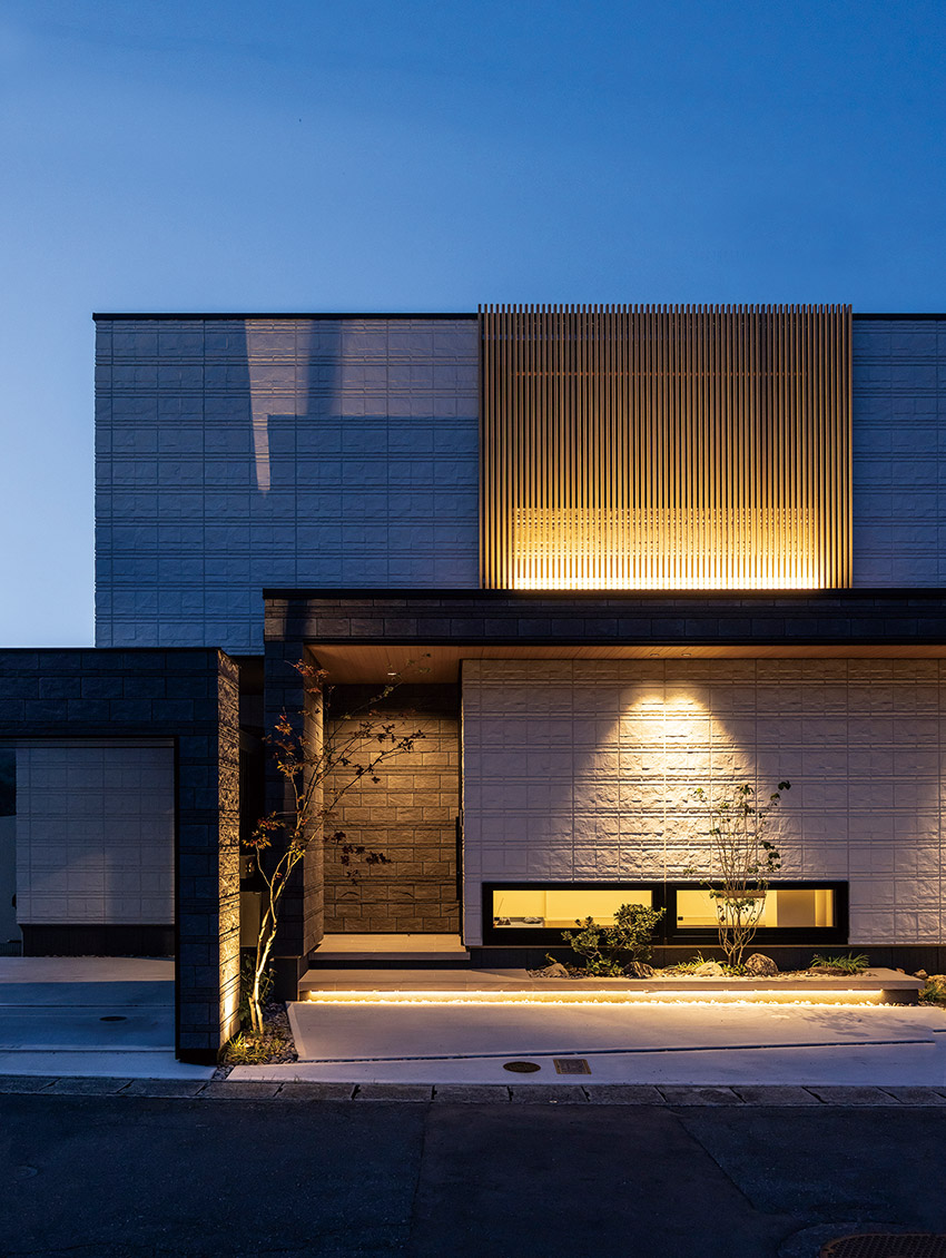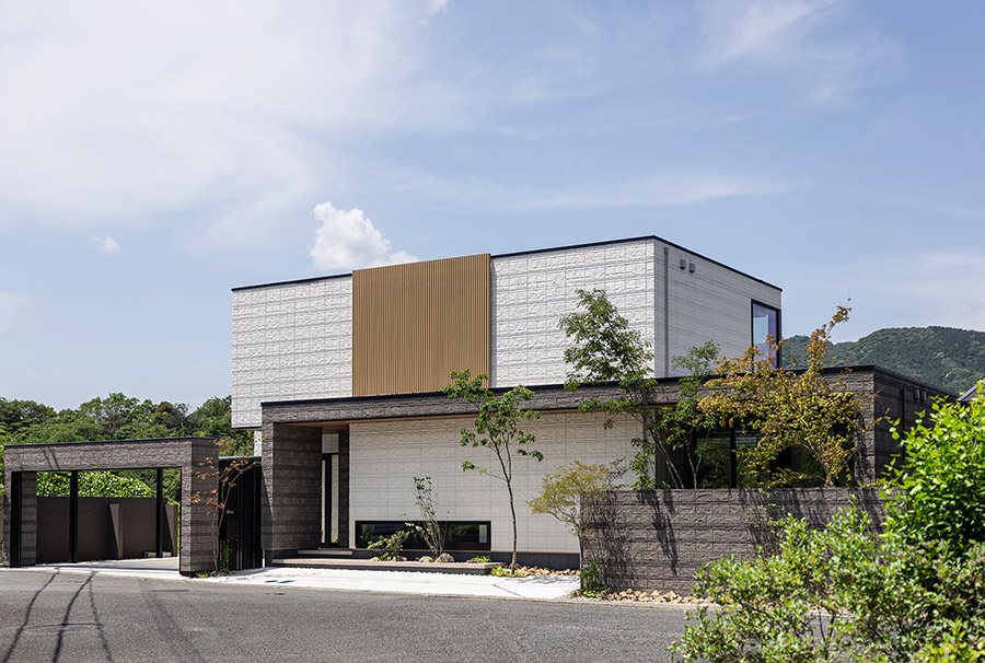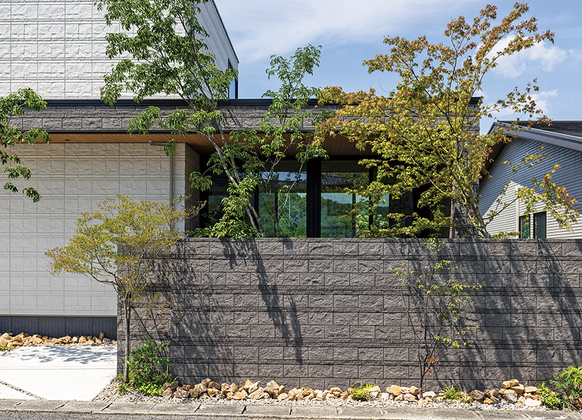 外観に洗練されたデザインを求められたのは、夫の達也さん。設計士は、間口の広さを生かし、山々を背に堂々とたたずむ風格あるファサードを提案しました。シンプルなボックスシルエットを基調に、シャッターゲートとパラペット※を組み合わせたフレームデザインが、印象的な表情をつくり出しています。