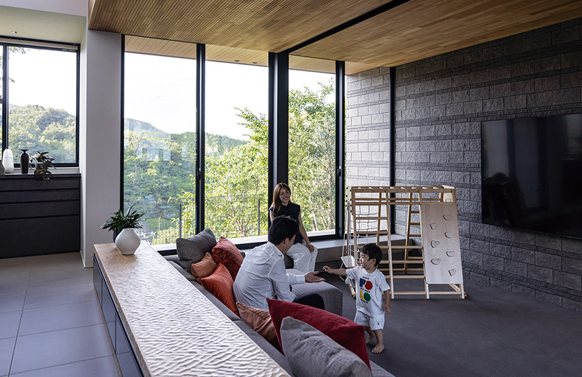 カーペット敷きのリビングにごろんと寢転び、外の景色を眺めるのがご家族のお気に入りの過ごし方。長男の天凰(てんま)くん(2歳)は、木の枝に止まる鳥を見つけるたび、楽しげに聲をあげるそう。窓越しに広がる自然が暮らしの一部となり、家族の毎日に喜びを運んでいます。