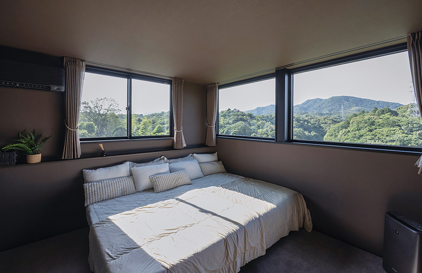 主寢室はダークカラーでコーディネートし、落ち著いたリラックス空間を演出。1階よりもさらに開けた眺望が、絵畫のように空間を彩ります