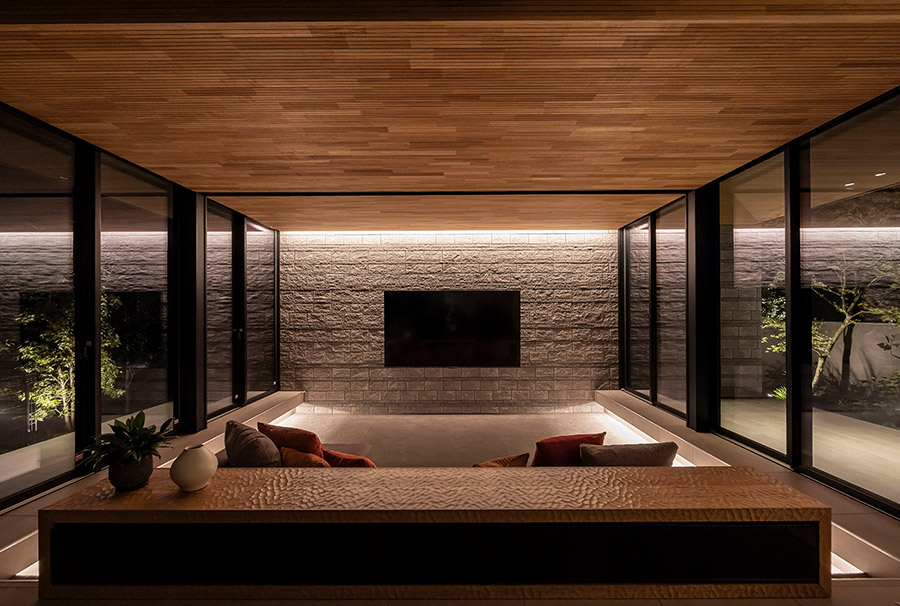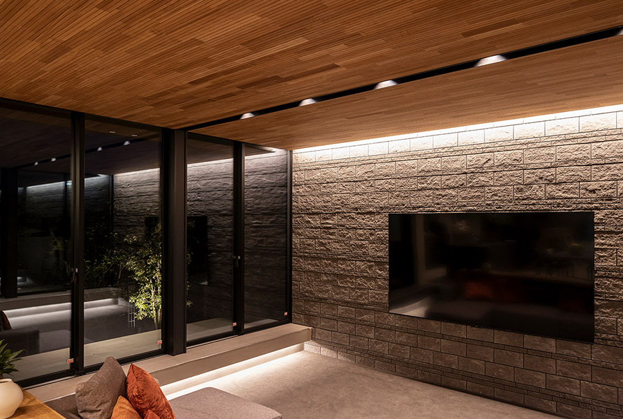 夜の帳が下りると、リビングを挾む2つの大窓は黒い鏡面へと姿を変えます。コーニス照明の光がガラス面に映り込み、途切れのない光のラインとなって空間に無限の奧行きを與えます。化粧天井には1本のスリットを設け、ダウンライトを埋め込みました。スリットと窓枠が描くコの字型のフレームは外観デザインと呼応し、住まい全體に統一感ある美しさをもたらしています。
