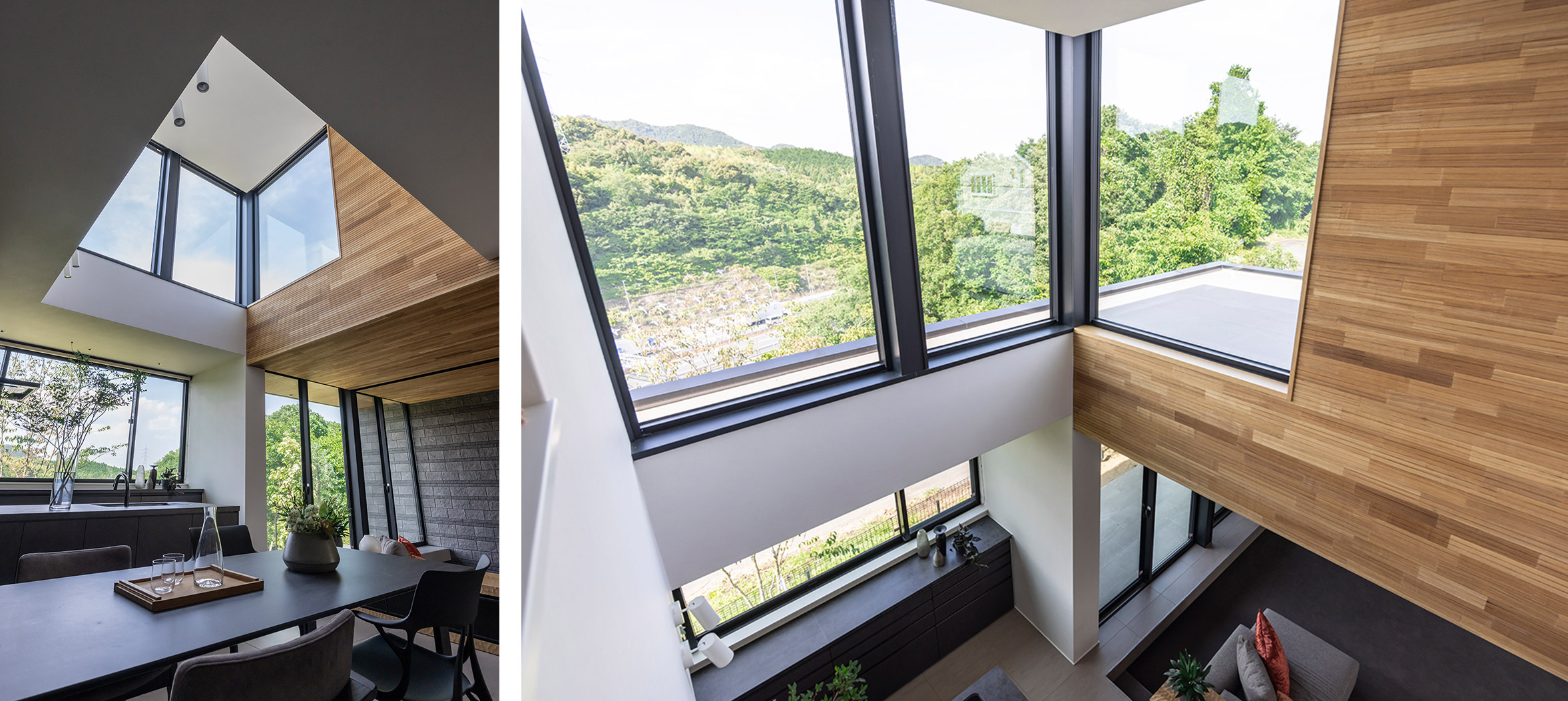 北面だけでなく東面にも窓を設けたことで、午前中は朝日がLDK全體を柔らかく包み込みます。ダイニングから見上げれば切り取られた青空が広がり、2階ホールから見下ろせば緑豊かな山々が目に飛び込む。場所ごとに変わる景色が、インテリアの一部として日々の暮らしを彩ります。