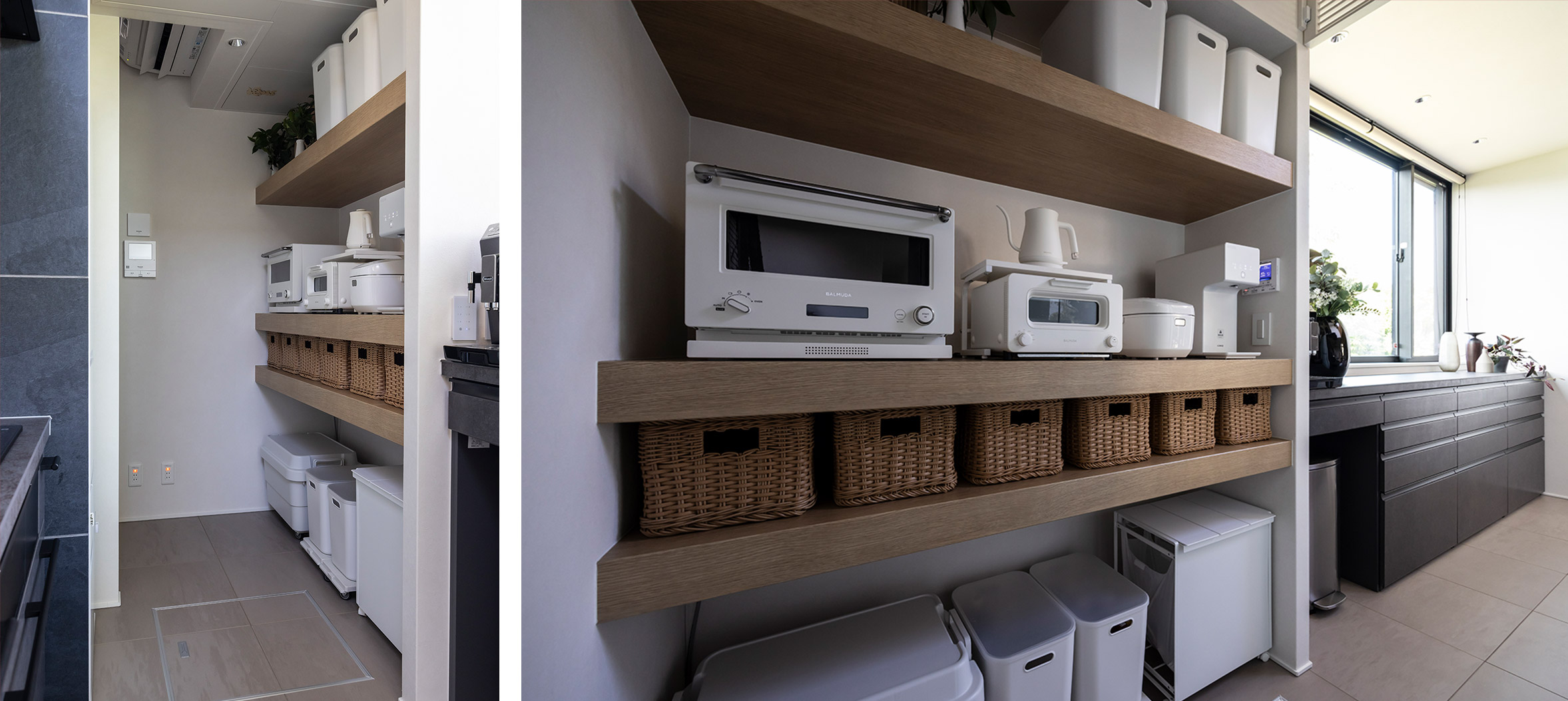 「できる限り生活感をなくしたい」という理紗さんの美意識は、パントリースペースにも表れています。白で統一された家電や収納ケースが整然と並び、目に觸れない場所にまで行き屆いたこだわりが感じられます。