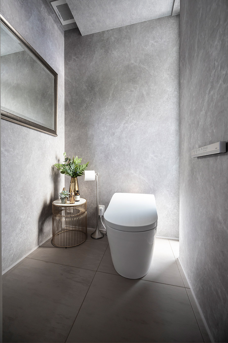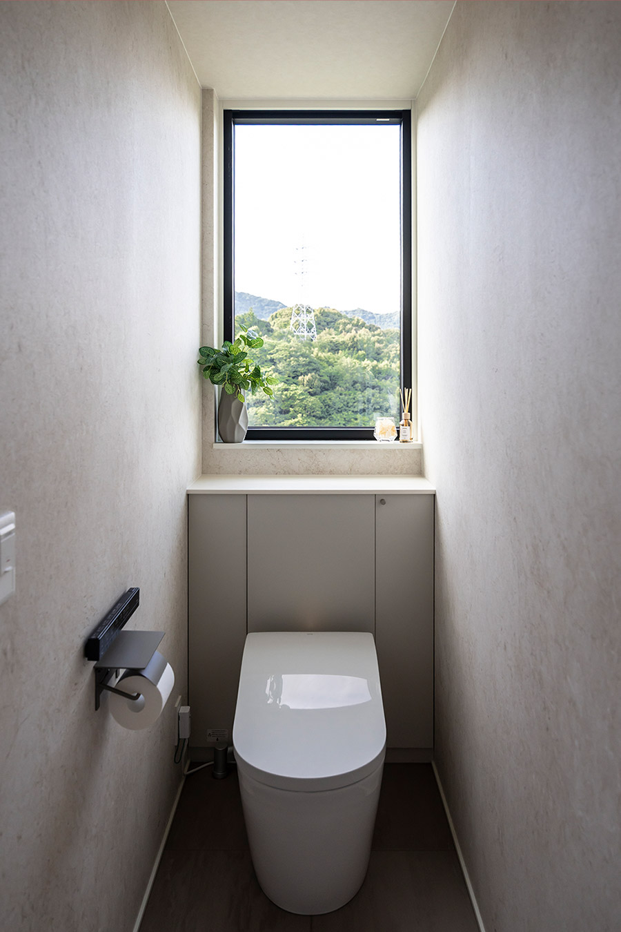 1階のトイレはスリット窓から入る光が陰影を描き、落ち著いた印象。2階は大膽に窓を設けて開放感を演出。どちらもグレージュでコーディネートされた、心地良い空間です。