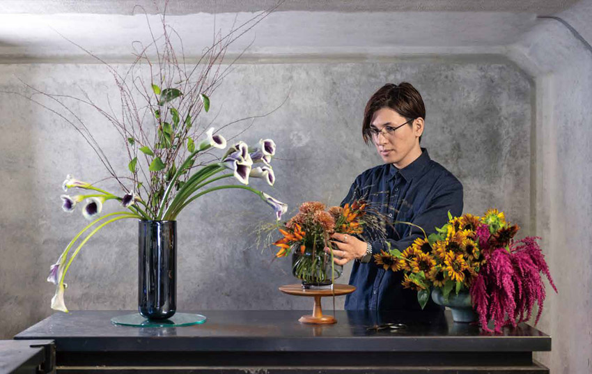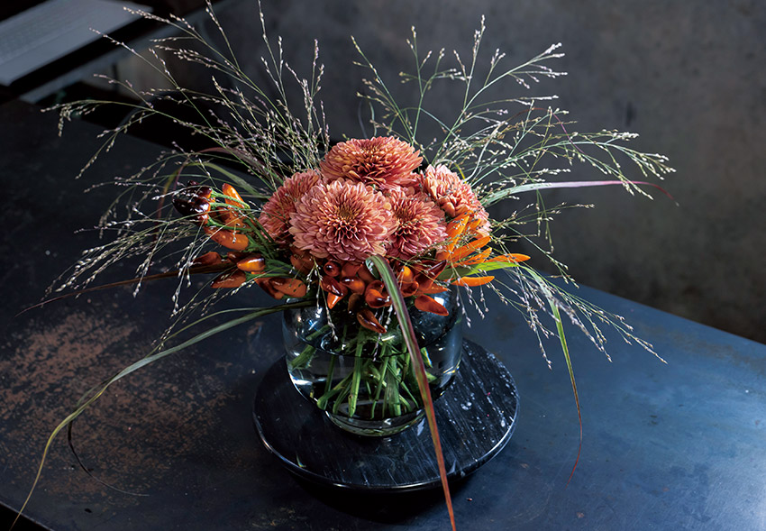 好きな花種を問われると、迷うことなく「全ての花を愛しています」と斷言。季節ごとに変化する花とのめぐり逢いを、いつも楽しみにしています。本や映畫や音楽など、さまざまな作品からインスピレーションを得てフラワーアレンジに落とし込むこともしばしば。新しい作品を作るたびに思わぬ気付きがあり、想像を超えるでき上がりに歓喜することもあるそうです。