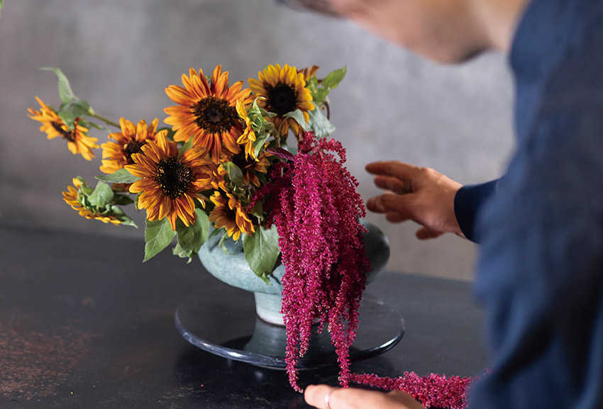 取材時に作っていただいた作品は、「ダージリン」という珍しい種類のヒマワリとアマランサス(紐ケイトウ)の2種類を使ったアレンジです。少ない花種でデザインを作るのは、一輪の花に深く向き合うことができるから。「例えばヒマワリを30本使えば、1つの器の中に30通りの表情を出せます。そうすることで、多くの花種を使ったアレンジからは生まれない造形を生み出せるのです」