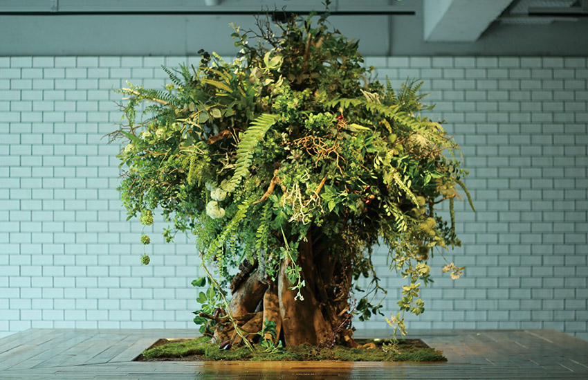 流木、枯れ枝、造花で制作したツリーオブジェ。多種多様な植物が大樹を棲み家に生態系を形成するというコンセプトで制作