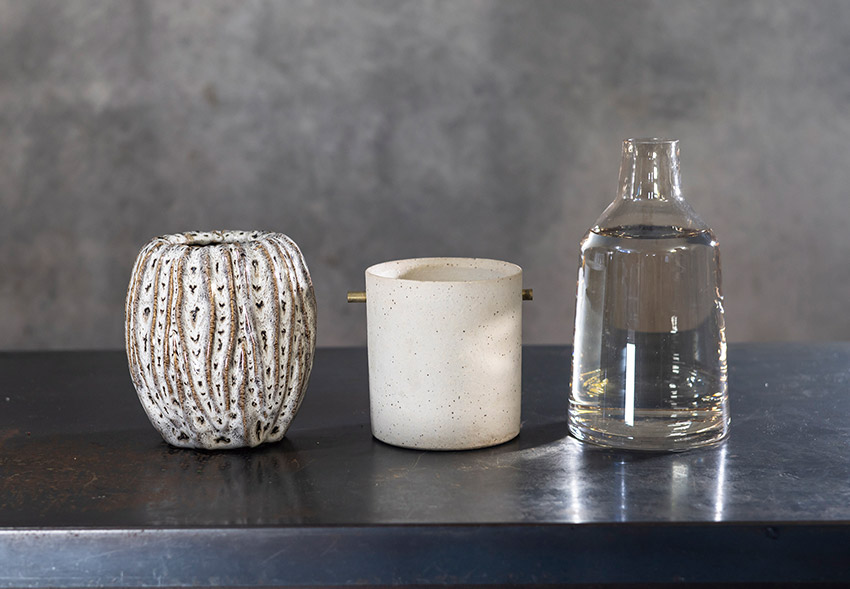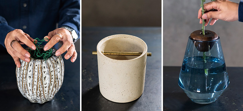 花留めには花瓶の口にはめて使うもの(右)や花瓶とセットで販売されているもの(中央)などさまざまなタイプがあります。丸めたワイヤーを底に入れて代用することもできます(左)