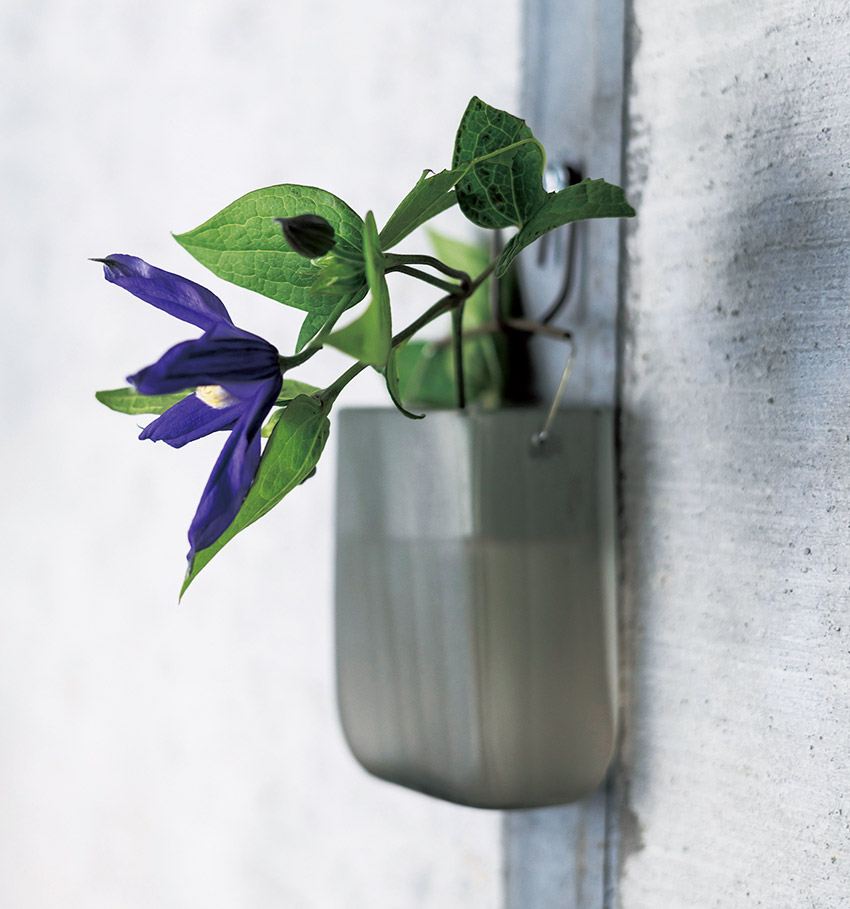 水回りなどの狹い場所やシンプルで少し退屈な壁に飾る小品には、つる性のテッセンなど、動きのある植物を選んで。「一輪の花を飾るだけでその場の空気が変わります」
