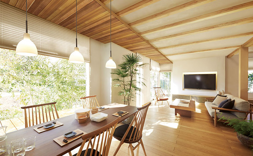 さらに、天井の色味や素材を変えてアクセントにするのも良い方法。板張りの天井を採用し、木目の向きは外に自然と視線が向かうように施すことで、より広がりを感じることができます。