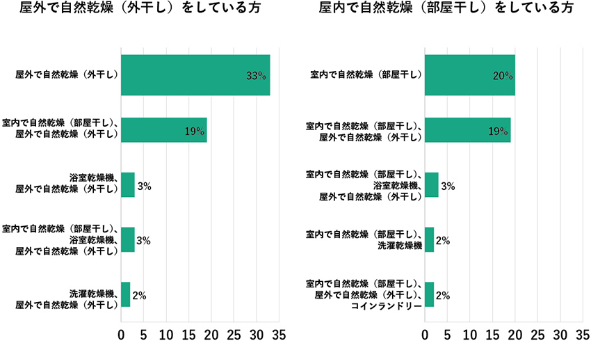 続いて、洗濯物の乾かし方に関する実態(tài)を伺うと、最も多かったのは「屋外で自然乾燥(外干し)」(33%)で、次いで「室內(nèi)で自然乾燥(部屋干し)」(20%)となりました。