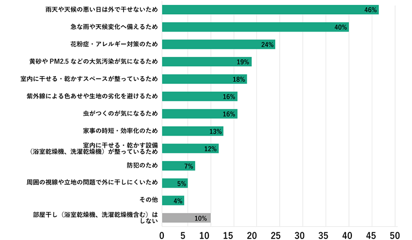 部屋干しをする理由を聞いてみると、前述でも觸れた通り最大の理由はやはり「天候」でした。「雨天や天候の悪い日は外で干せないため」(46%)、「急な雨や天候変化に備えるため」(40%)と、半數(shù)近くが天気に左右されて部屋干しを選んでいることがわかります。