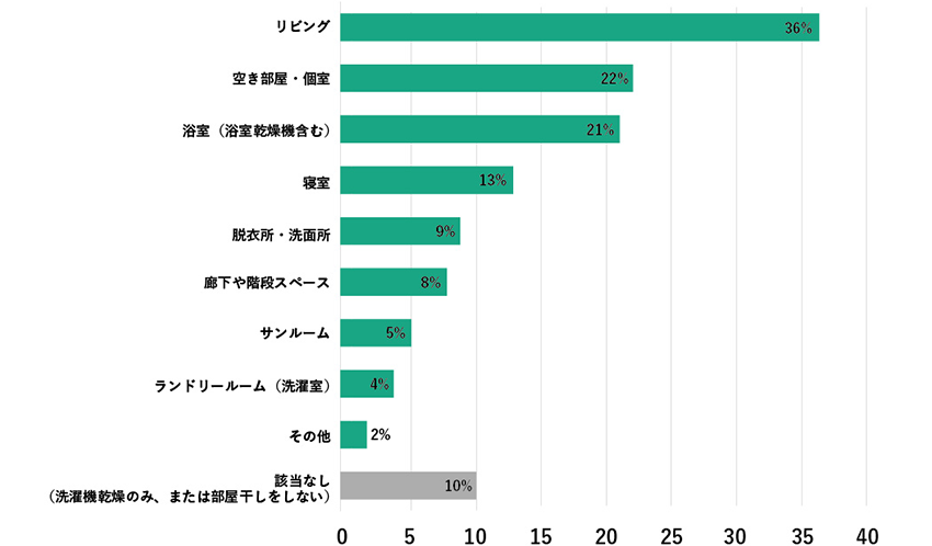 また、「浴室(浴室乾燥機(jī)含む)」(21%)を利用する方も目立ちます。ニオイや濕気がリビングに広がらないのが利點(diǎn)ですが、家族の入浴時(shí)間と重なると不便な上、電気代がかさみやすい側(cè)面もあります。「寢室」(13%)を利用するケースでは、夜に干して部屋の加濕を兼ねつつ、朝までに乾かすといったスタイルをとっている方が多い印象です。