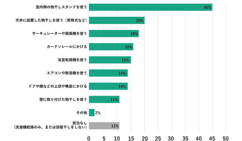 次に多かったのが、「天井に設(shè)置した物干しを使う(昇降式など)」(20%)。床をふさがないため、生活空間を邪魔しない點(diǎn)が支持されています。