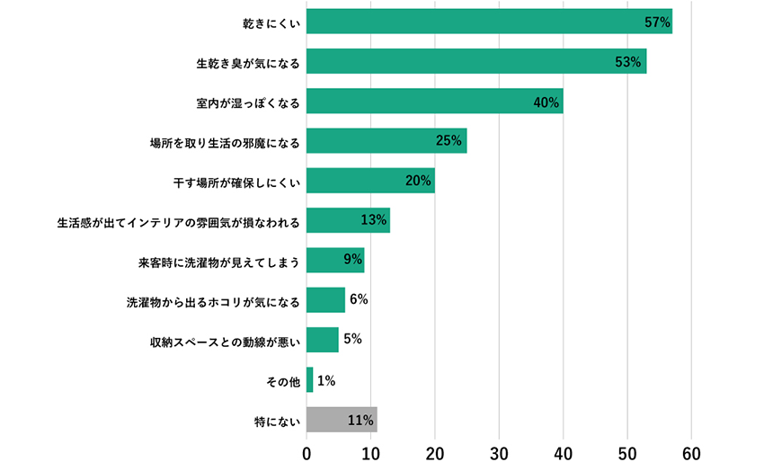 このようにさまざまな場(chǎng)所やアイテムを駆使して部屋干しをしているものの、部屋干し特有の悩みやデメリットもあるようです。次の設(shè)問(wèn)で詳しく見(jiàn)てみましょう。