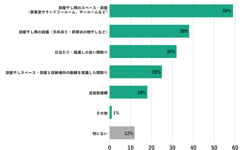 これまでの設(shè)問(wèn)を踏まえ、住まいづくりを計(jì)畫(huà)する際に、部屋干しを快適に行うために取り入れたい設(shè)備や工夫についてご意見(jiàn)を伺いました。結(jié)果は、全體の6割近くが「部屋干し用のスペース?部屋(家事室やランドリールーム、サンルームなど)」(59%)を希望しており、専用スペースのニーズが高いことが明らかになりました。いまや部屋干しは日常の洗濯スタイルのひとつ??爝mに行うための環(huán)境づくりは欠かせません。