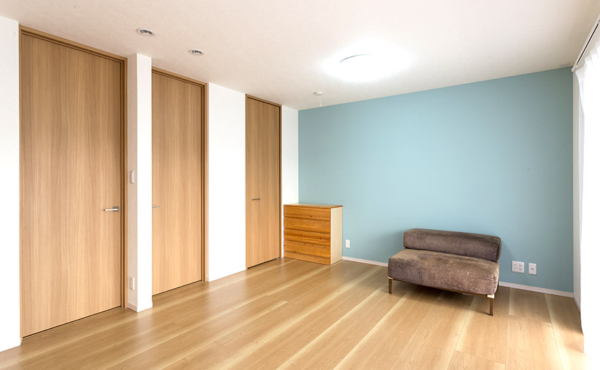 柔らかなパステルブルーのアクセント壁が引き立つ子ども部屋。集中力が増すといわれるブルー系で、勉強にも集中できる空間に。幼すぎない少しくすんだ色味なので、子どもが成長してからも違和感なく使えます。