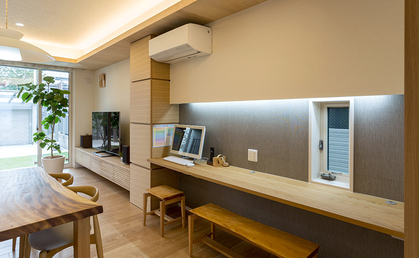 ちょっとした勉強スペースも兼ねたダイニングのカウンターには、グレーのアクセントクロスを採用。暗めの色味で奧行き感が生まれます。クロスの質感も感じられるよう間接照明を取り入れて、表情豊かに仕上げています。