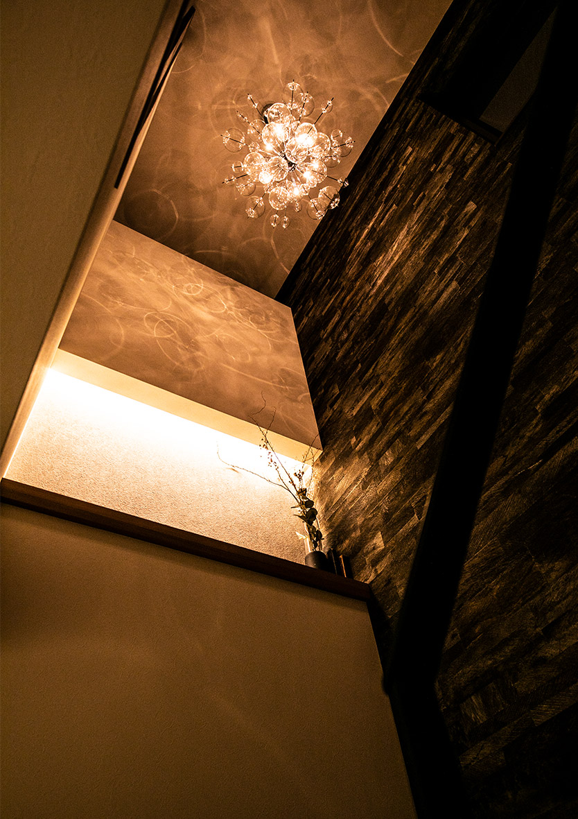 素材感のあるアクセント壁は、照明の當て方を工夫すると、光と影により立體感が出て、晝と夜で異なる雰囲気が生まれます。部屋の全體照明との組み合わせもポイント。また赤味のあるレッドシダーの壁には、少しオレンジがかった間接照明を當てるなど、素材と照明の色の系統を合わせると空間がまとまります。