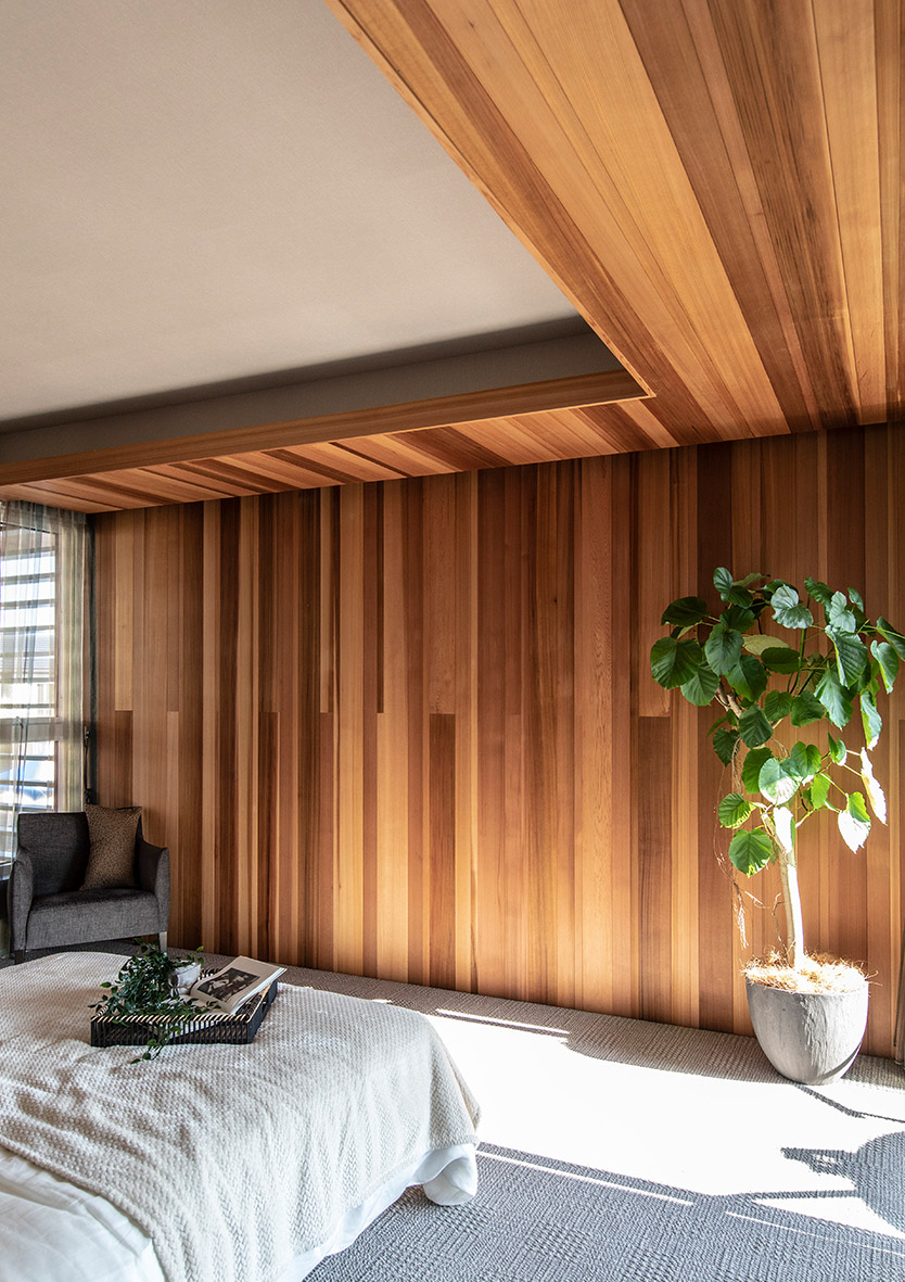 床や天井の色柄と組み合わせるのも面白いでしょう。下の寫真では廊下の天井から寢室の天井へ続く個性的なウッドパネルを、寢室のアクセント壁にも使用。廊下から寢室へと流れが生まれ、まとまりが感じられます。