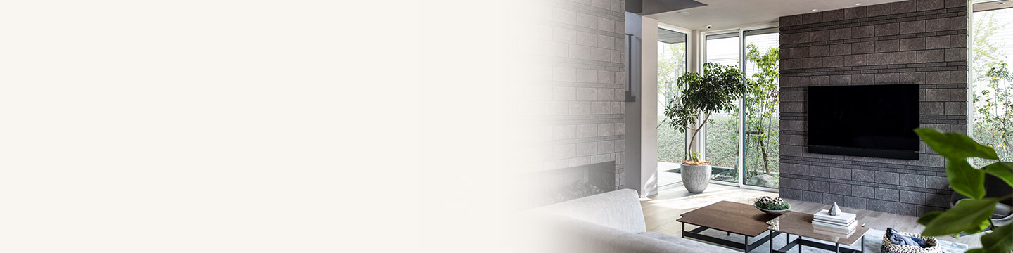 室內と室外の素材を合わせると、家全體に統一感が表現できます。テラスへとフラットに続くオープンなリビングには、その間取りをさらに引き立てるため、外の柱に使用している外壁用タイルをアクセント壁にも使用。內と外がつながり、開放感ある空間に仕上がります。