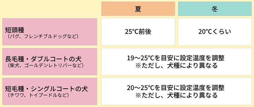 20?25℃を目安に設定溫度を調整。「短毛種」とは被毛の長さが3cm前後の犬種で、「シングルコート」とは被毛がオーバーコートのみの犬種です。保溫力があるアンダーコートの毛がないことで、シングルコートの犬種は寒さに弱い一方で、暑さには強い傾向があります。ちなみに、小型犬として人気のチワワは個體によって短毛と長毛の両方のタイプがいます。
