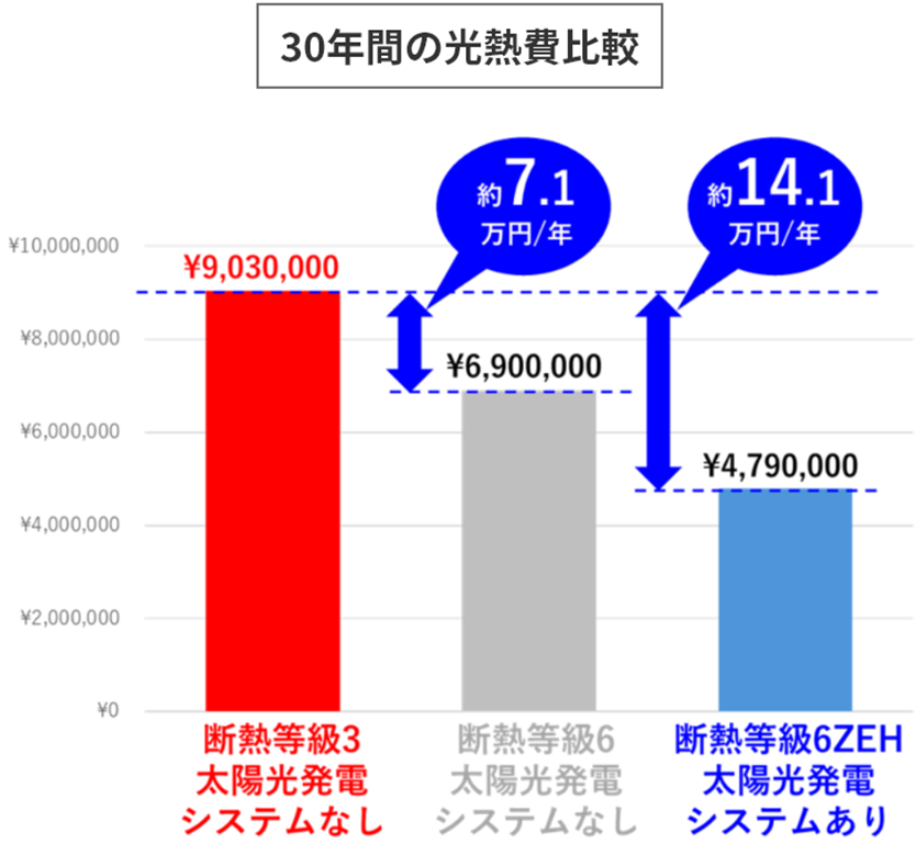斷熱等級6の住宅は、1992年制定の新省エネ基準に即した斷熱等級3の住宅と比較して、最高気溫40℃の夏場にエアコンを消したときの溫度上昇を最大約5~6℃低く抑える※1ことができます。また、斷熱等級6にすることで斷熱等級3と比較して年間光熱費を約7.1萬円削減でき、さらに太陽光発電システムを搭載することで年間光熱費を約14.1萬円削減することも可能です※2。