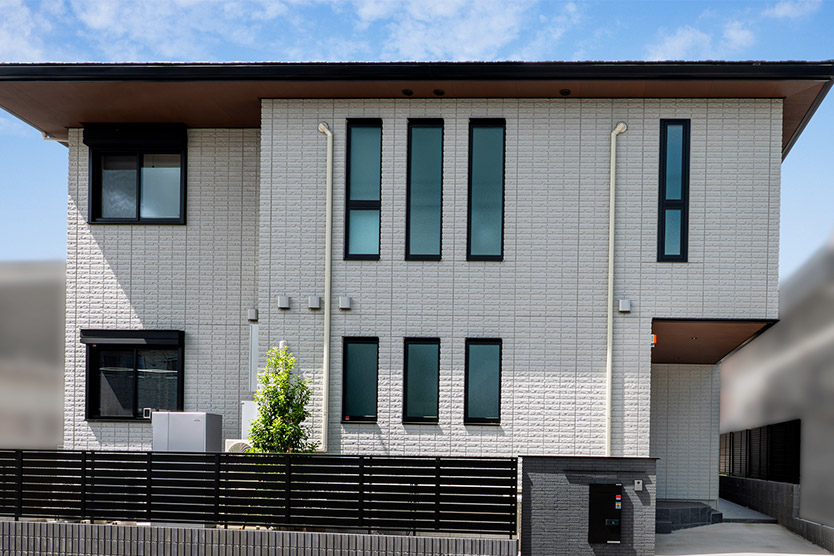 このプロジェクトは土地探しからスタートしました。大和ハウスがご提案した土地は、敷地の正面と裏面が道路に接しており、建物に“スタジオ”と“住宅”という2つの顔を持たせるのに良い條件が整っていました。祭りの日に山車が練り歩く駅側(正面)は、ミニマルなファサードが印象的なスタジオの顔。住宅街側(裏面)は、上品な戸建住宅の佇まいを見せています。