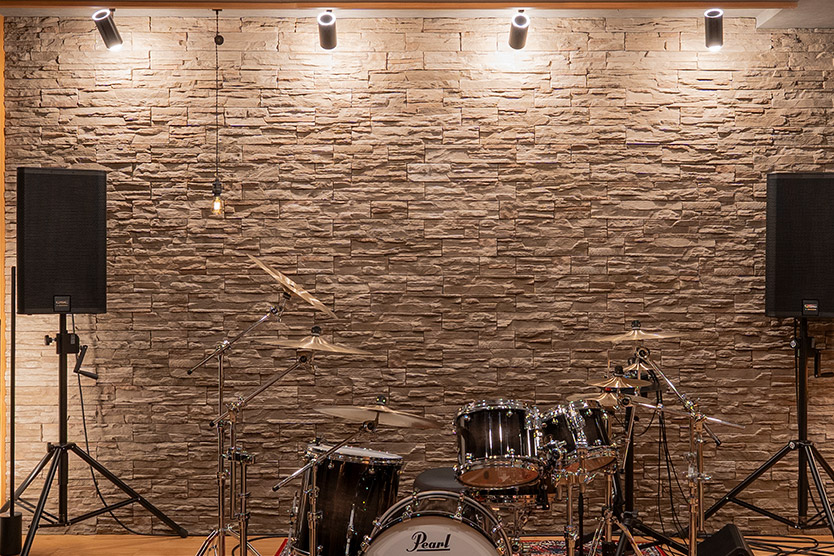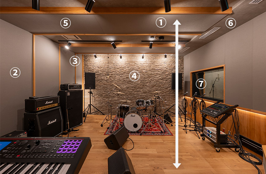 生の音に近いクリアな音を録るために、音の反射と吸音のバランスを細かく調整。ドラム背面の荒々しい石壁④は、音を拡散しつつ、音のパワーを前に押し出す効果があります。撮影や配信でも映える內裝です。