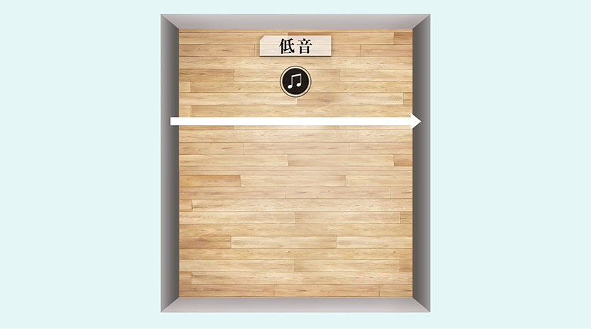 さらに、壁の一部に、裏側に音が抜けるベーストラップ③を組み込み、問題となる低周波數帯を吸音。低音のこもりを抑え、すっきりとした響きを得られるようになっています。