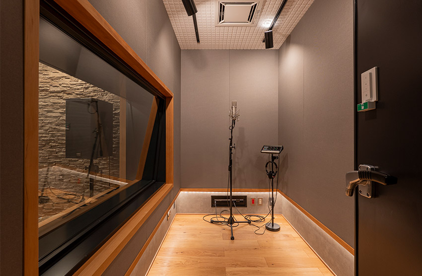 Aスタジオの隣にあるボーカルブース⑦は、防音ガラス越しにお互いの姿を確認。バンド演奏とボーカルを同時収録する際も、アイコンタクトやジェスチャーでタイミングが合わせられます。