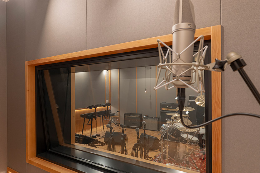 ボーカル以外にも、アコースティックギターやホーンセクション、バックコーラス隊が入れるように、少し広めのスペースを確保。また、窓ガラスは音の拡散を狙い、斜めに設置しています。