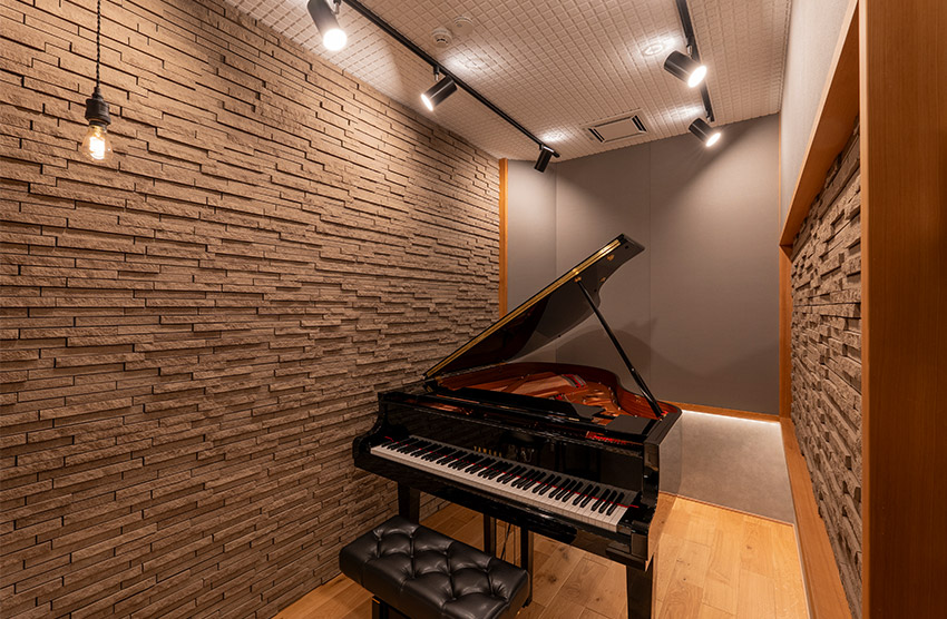 ここはピアノ専用のスタジオです。ピアノの響きを生かすために、左右2面を石張りにして、音をほどよく反射?拡散させました。ピアノの音は一度、ふた(大屋根)に當たってから右へ飛び、その後、反射して左へ。音が分散して広がることで、気持ちよく演奏できるようにしています。