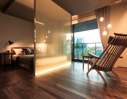ガラスの間に布地を挾み込んだファブリックガラスは、ぼんやりと向こう側の様子がうかがえ、ゆるやかにスペースを區切ることができます。照明器具と組み合わせれば、ファブリックをつたって柔らかい光が部屋全體を優しく照らします。