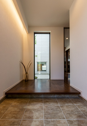 大勢の人が一度に出入りしても余裕のある玄関ホール。間接照明のやわらかな光でお客さまを迎えます