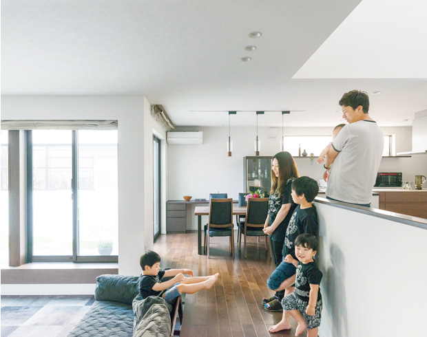 「子どもたちが自由に走り回れる家であることを第一に考えました」と語るのは妻の麻衣子さん。土地探しを含め、4年をかけて完成したお住まいは、琥太郎(こたろう)くん(9歳)、凰仁郎(おうじろう)くん(4歳)、麟之丞(りんのすけ)くん(2歳)、祭(まつり)ちゃん(0歳)の4人兄妹がのびのびと遊び、その様子をご夫妻がいつも見守れる間取りが特徴的です。