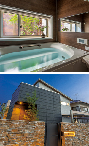 上:坪庭のイロハモミジを眺めながら入浴できるバスルーム